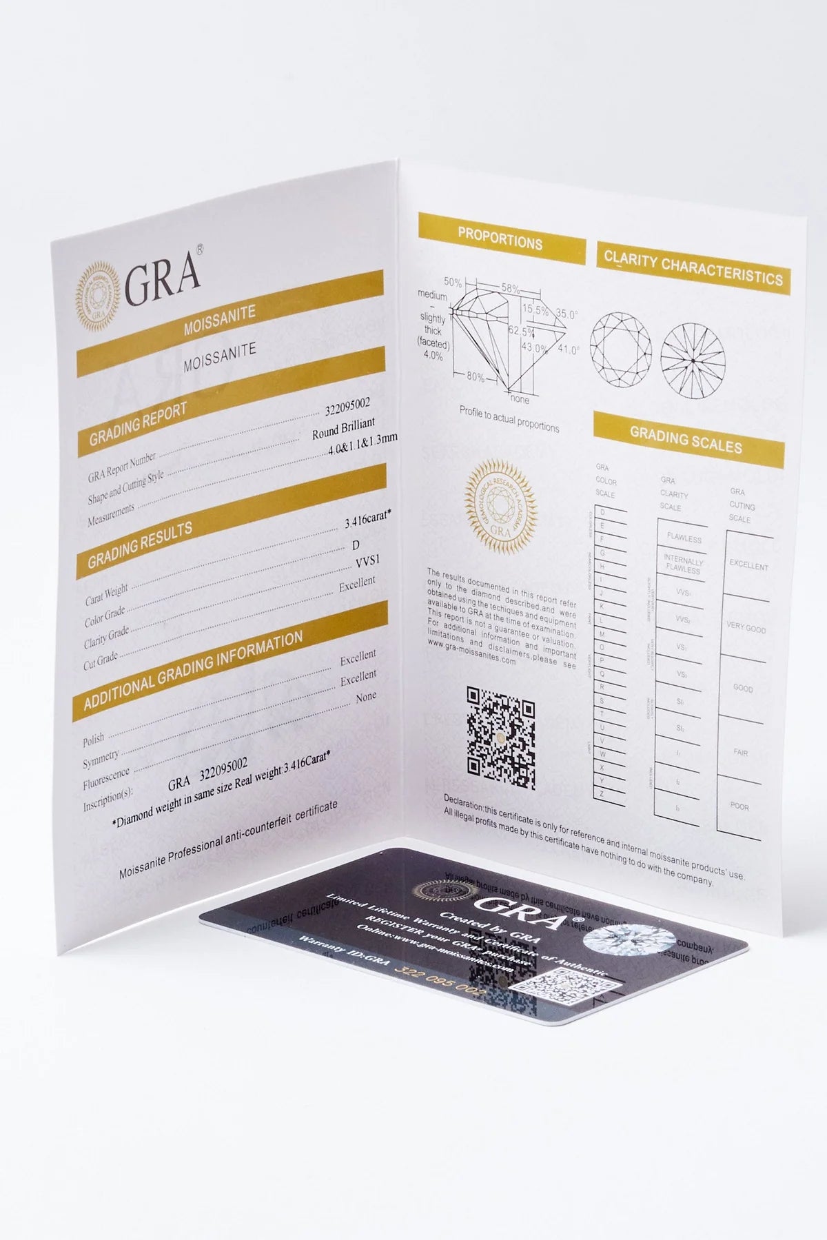Todas as nossas joias com Moissanite acima de 0.30ct acompanham o certificado GRA, emitido por um dos laboratórios mais respeitados do mundo.